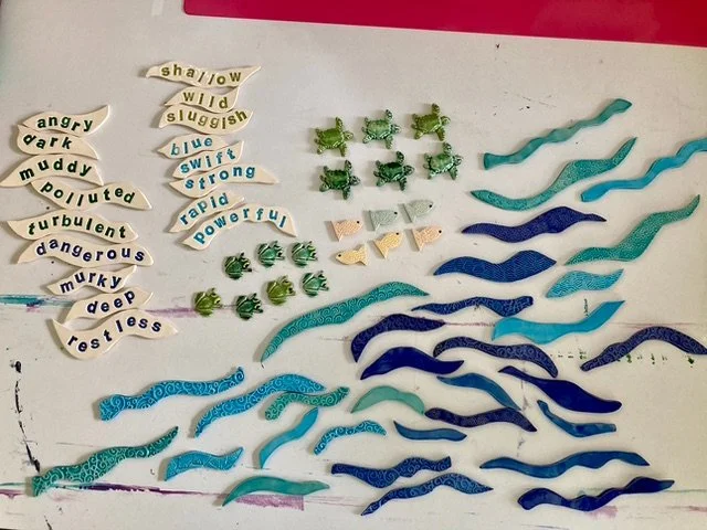 I worked with 94 students in grades 3–5 at Willow Elementary to design and create mosaic stepping stones for the school’s sensory pathway. Through a series of in-class workshops, we explored the ecology of the nearby Napa River and used river-themed words, animal tiles, and native plant imagery to shape the designs. After finishing the mosaics in my studio, I installed them in a flowing river pattern with help from staff and volunteers. The project now supports daily use by students needing sensory breaks and has become a valued part of the school’s Artful Learning curriculum.